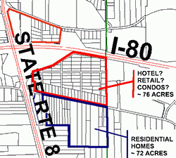 west, 57 acres would be used for cluster homes. The most recent proposal showed up