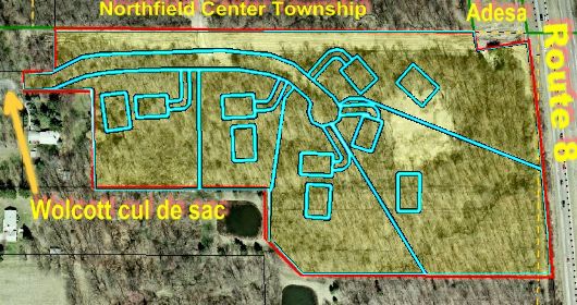 Mr. Petros stated that he would be presenting a development plan for the property at next month's Planning Commission meeting. He exhibited some drawings showing a schematic representation of what he had planned. In summary: of the 168 acres, the easternmost 60 acres, stretching along Route 8, would be converted to retail business use, with most of the balance used for 100 single-family homes. (Note that some of this acreage will be acquired by the State of Ohio for use in a Route 8 access ramp to Hines Hill Road.)