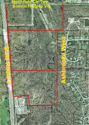 The total property within Boston Heights consists of three parcels: parcel #1300899, parcel #1400409, parcel #1400403 totalling about 156.5 acres. This property is all in the RB Retail Business District; the County is considering whether to build a new access road through this land from Hines Hill to Twinsburg Road. The first two parcels were lately transferred from "Five J-CTMS Ltd", another company associated with Mr. Mangione. The latter was lately purchased from Brandywine Preserve, the developer of the townhouses along Twinsburg Road north of Ashbrooke West. American Dream also now owns an additional 49 acres in Northfield Center Township, contiguous to the Boston Heights property and extending all the way up to Twinsburg Road.